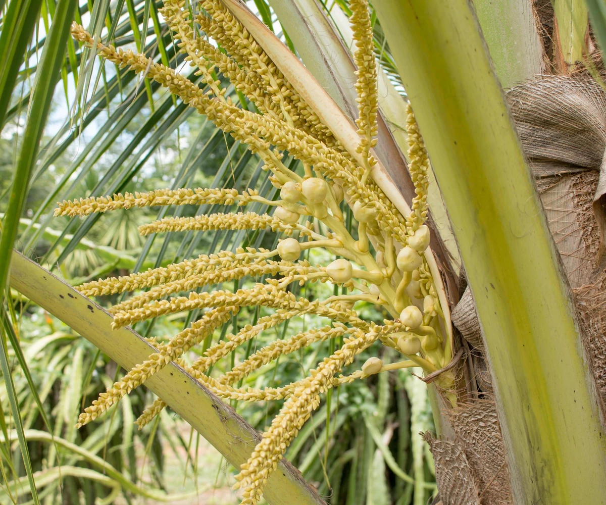 Le cocotier est monoïque, ce qui signifie qu'il porte à la fois des fleurs mâles et femelles sur la même inflorescence.