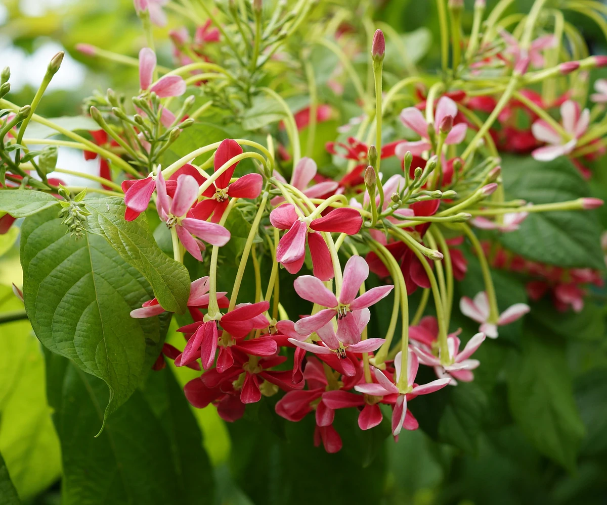 La liane de Rangoon est une fleur tropicale fascinante, connue pour ses grappes qui changent de couleur du blanc au rose puis au rouge.